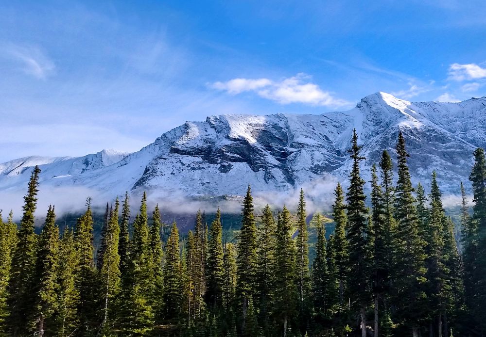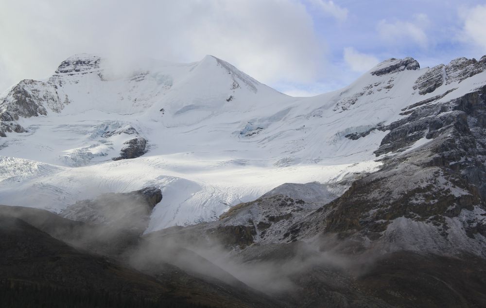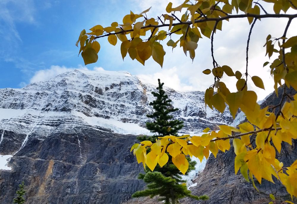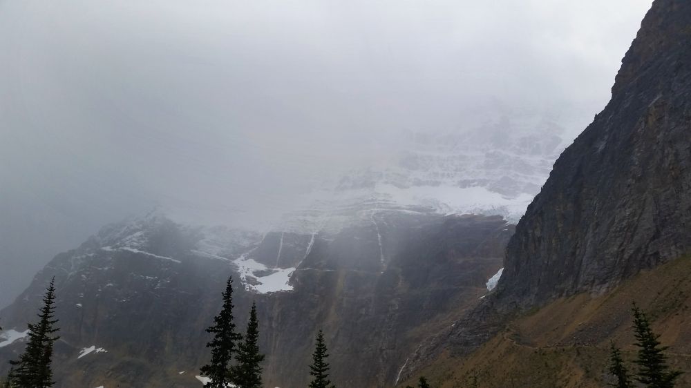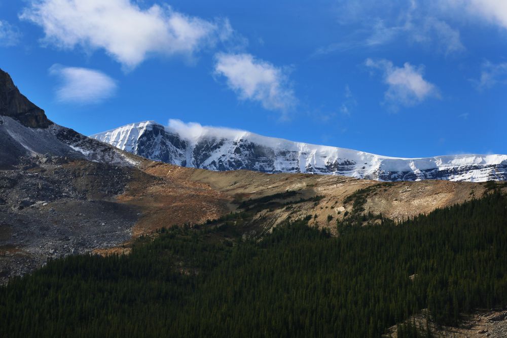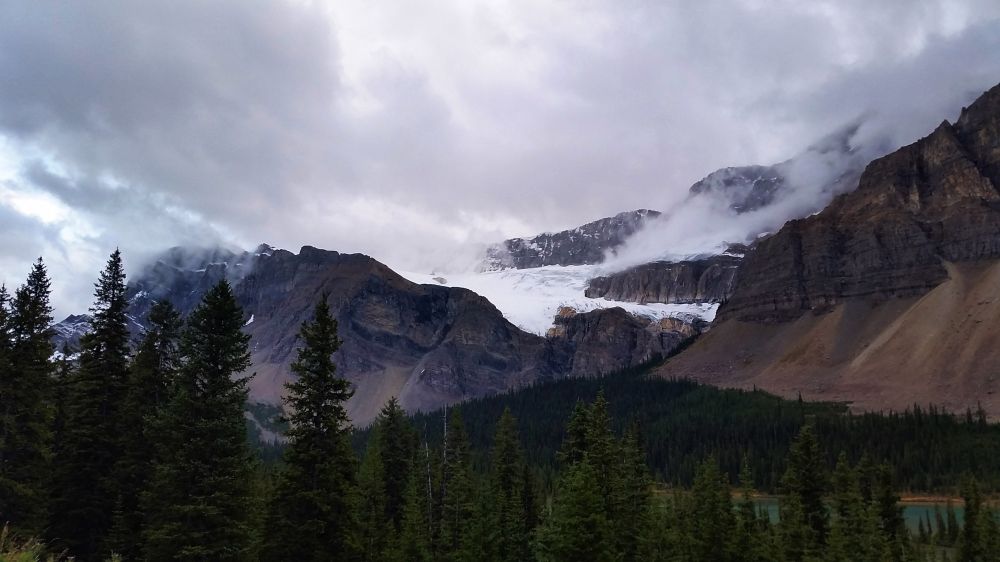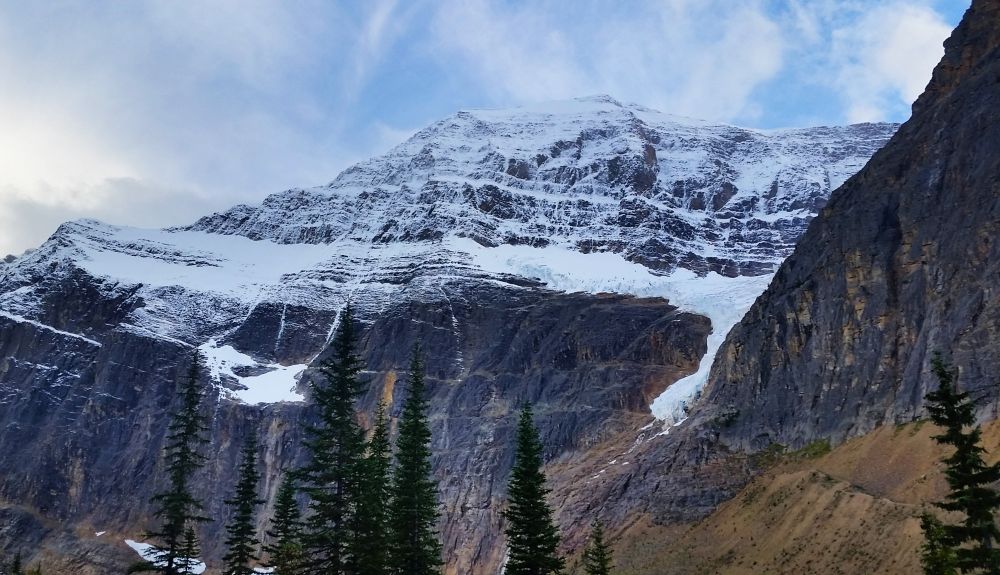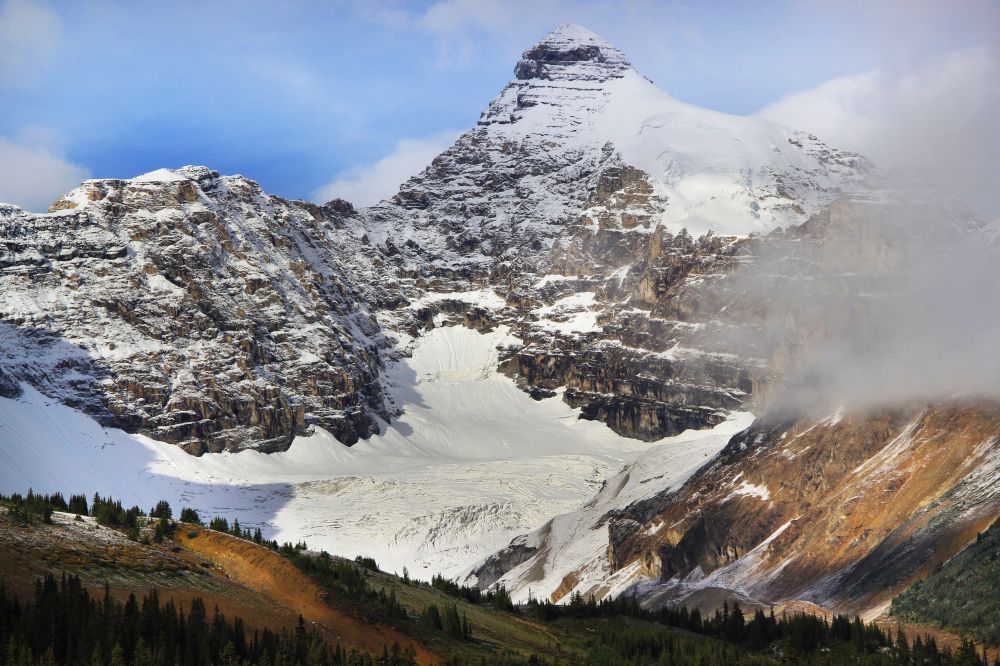 九月初,班芙地区已经开始下雪了,我们到的前一晚刚刚下过雪,冰山顶上覆盖着一层薄薄的新雪。