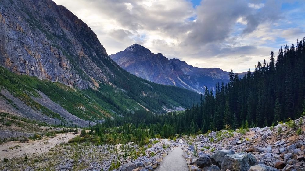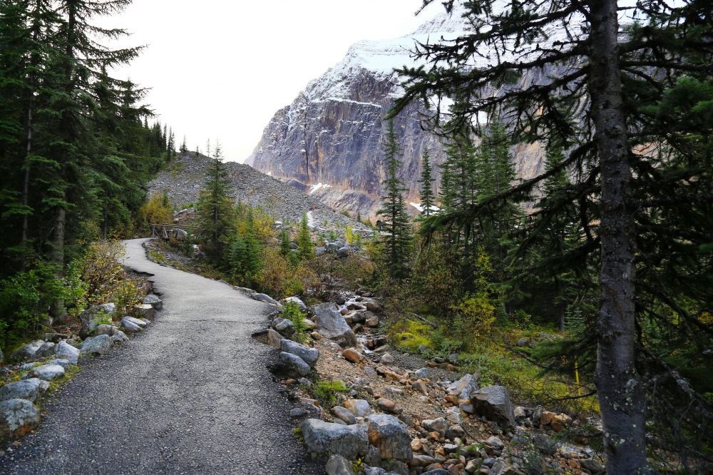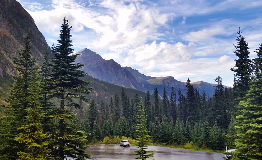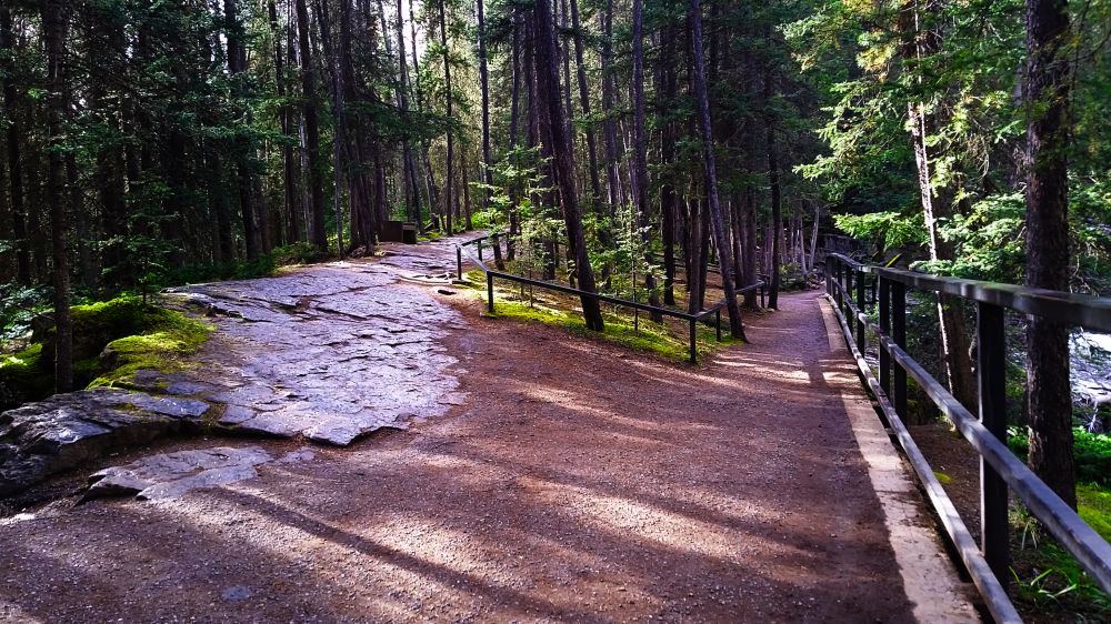 没想到在Trail里还淋了一场雨。因为trail不长,我们偷懒没背包也没带雨伞,没想到半路就突然下起了雨,等走出来时外套已经湿透了。出了峡谷范围居然又是晴空万里。想到之前在Johnston Canyon就下雨,早上在Mistaya Canyon里也烟雨朦朦的,好像我们一路上只要是碰上峡谷就一定会下雨。。。?