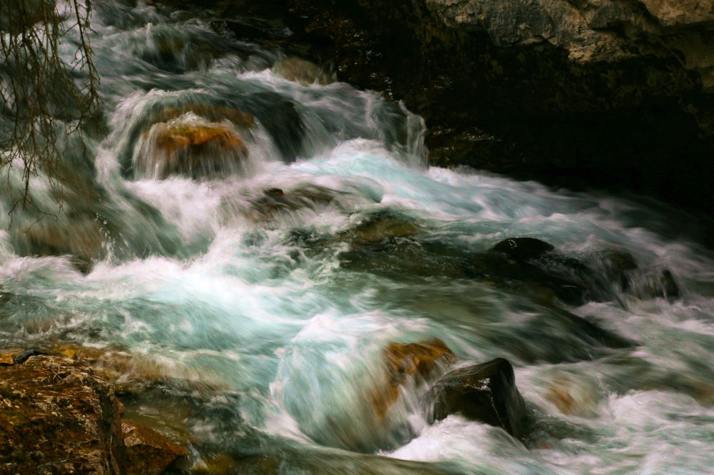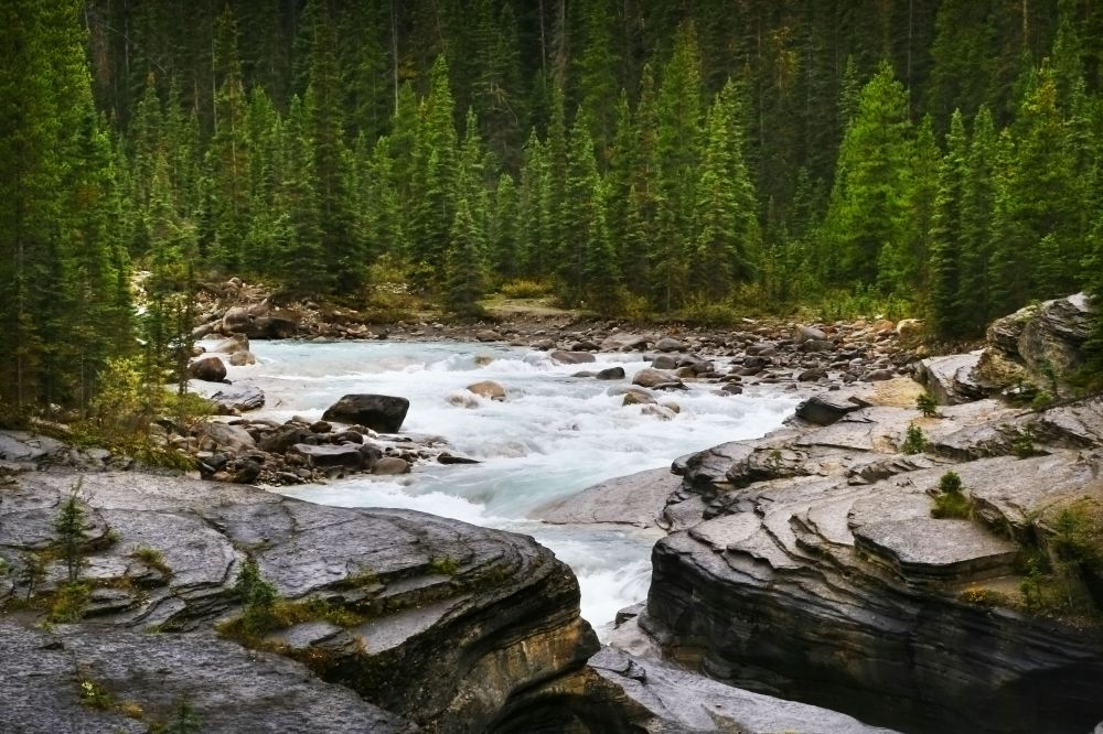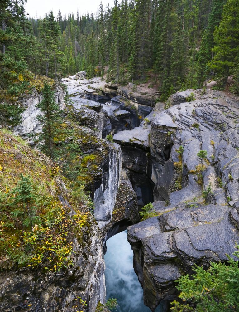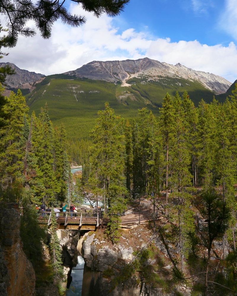 Mistaya Canyon只有一个lookout,离停车场不太远,走900米时能看到一座桥,就是Canyon的viewpoint了。这个峡谷比较小,是由 Mistaya River冲击形成的,曲线优美,水流湍急,很震撼。远远看去峡谷没什么特别,但是近看会发现两岸的石头离得很近,而底下的水流则很深,很急。有时站在一边都有跳到另一边的冲动。