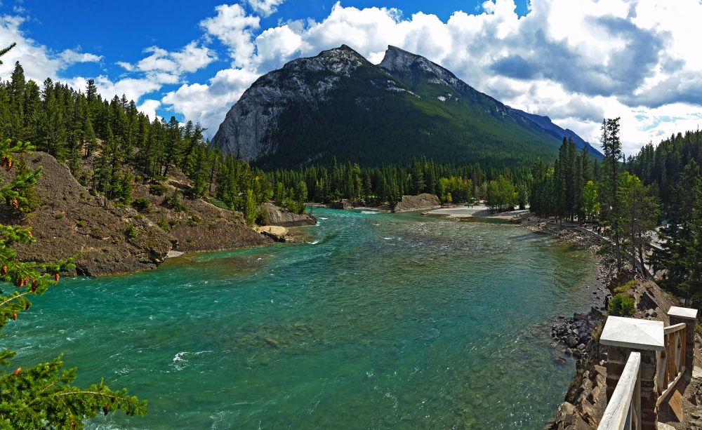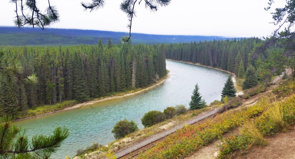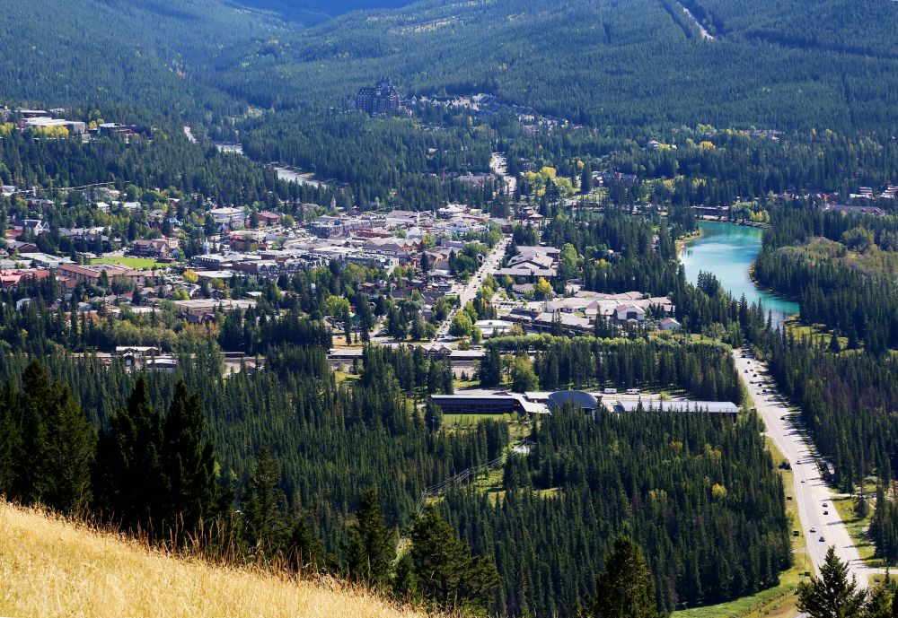 从Lookout看过去,Banff Town尽收眼底,弓河就像一条绿色的丝带飘扬。