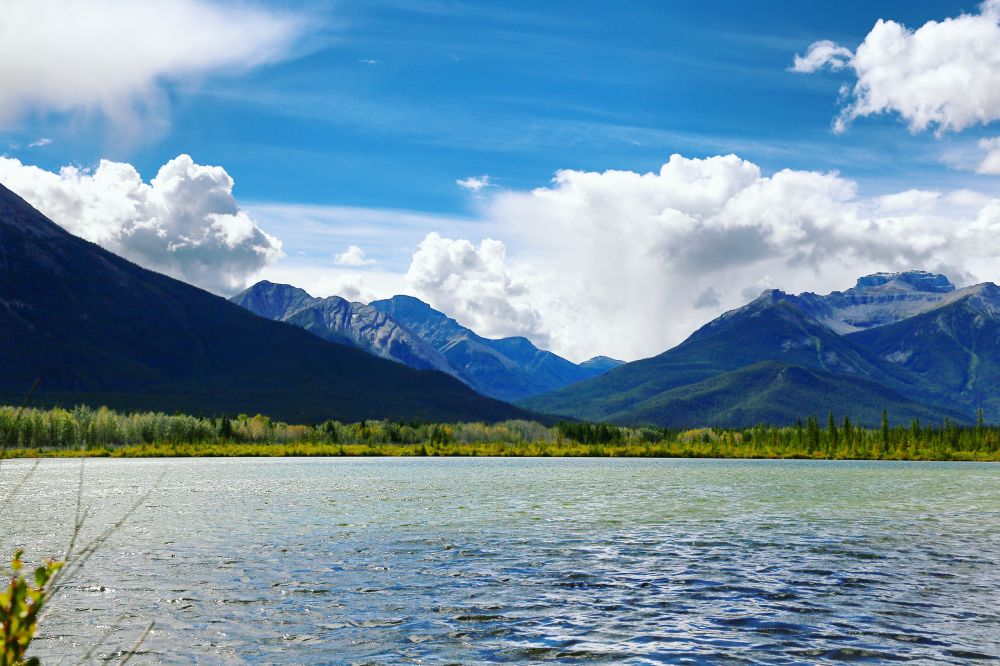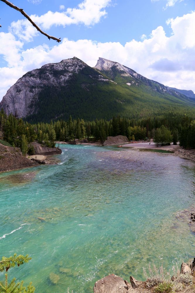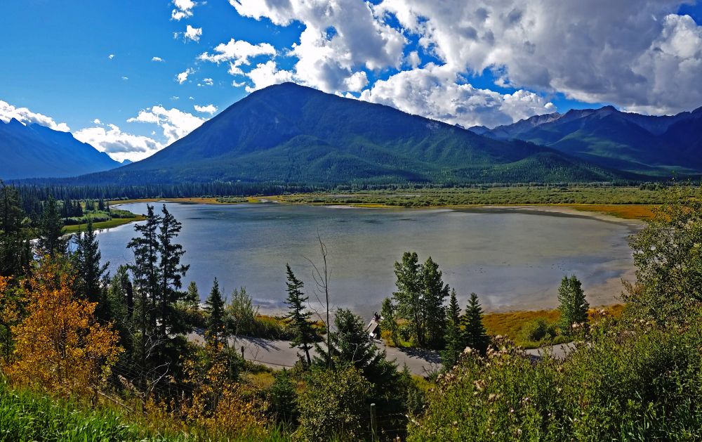 在Vermillion Lakes视野很开阔,可以看见对岸的山峰。左边的山峰是Mount Rundle,右边的我就不知道了。