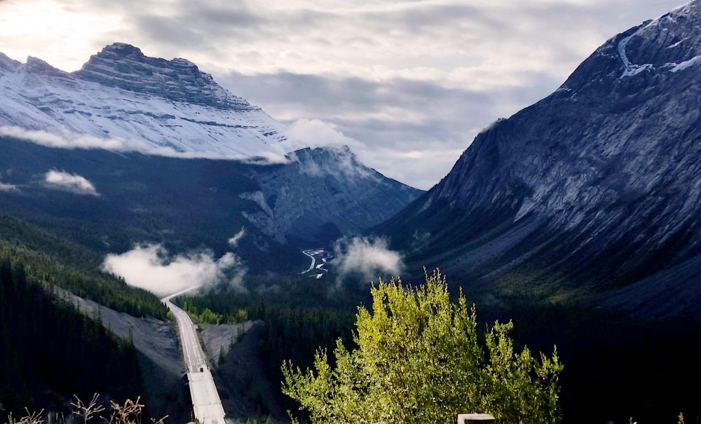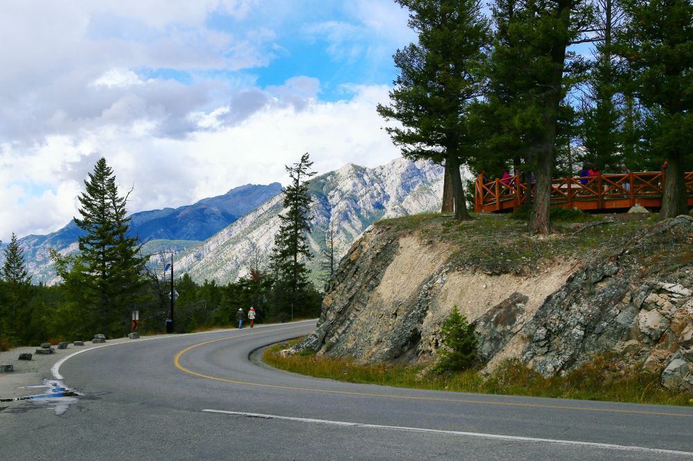 在冰原大道上离Discovery Center只有10分钟的地方有一个大大的U型弯道,U型弯道尽头有一个Lookout,是回头望雪山的最佳位置。转过弯道上山后,可以看到下面来时的路。