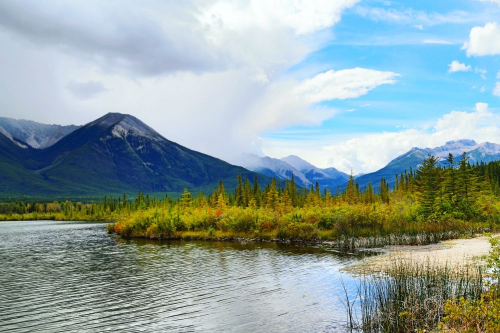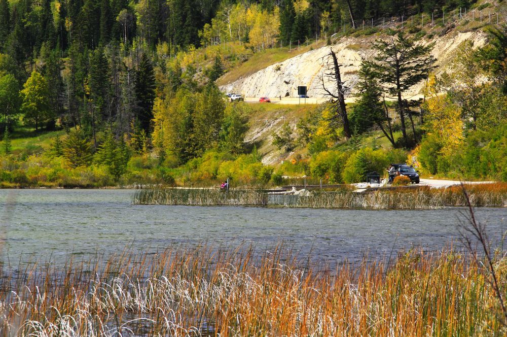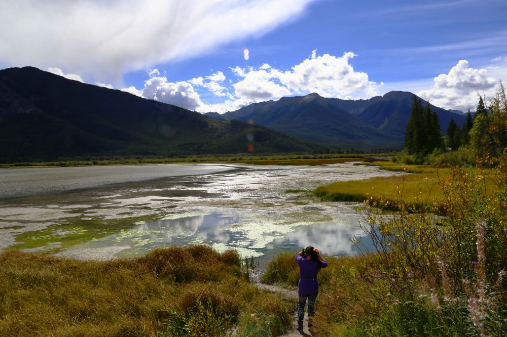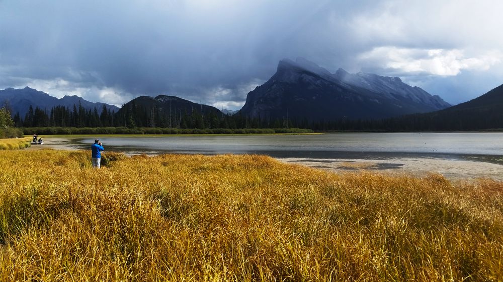 在Surprise Corner时,又下起了雨,我们也没有停留多久,直接离开去了Vermilion Lakes。说是湖,其实在我看来更像是一片沼泽地,也不知是不是秋天水位降低的缘故。再加上光线的角度不够好,颜色不够,水面也不够平静映照群山倒影,总之是有小小失望的。据说在这里看晚霞倒影是最美的,但我们应该是没有这个幸运了。