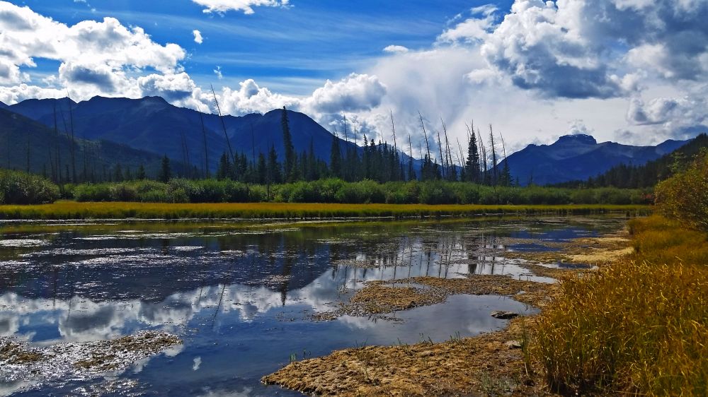 走到Vermillion Lakes湖区的尽头,水越来越浅,完全变成沼泽地了。
