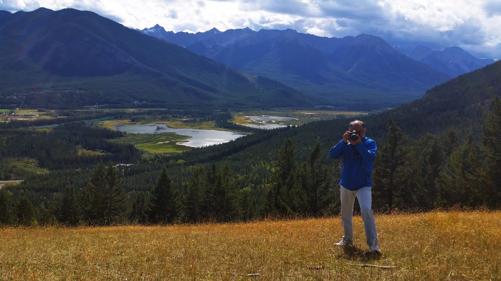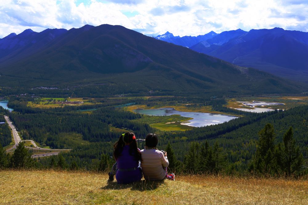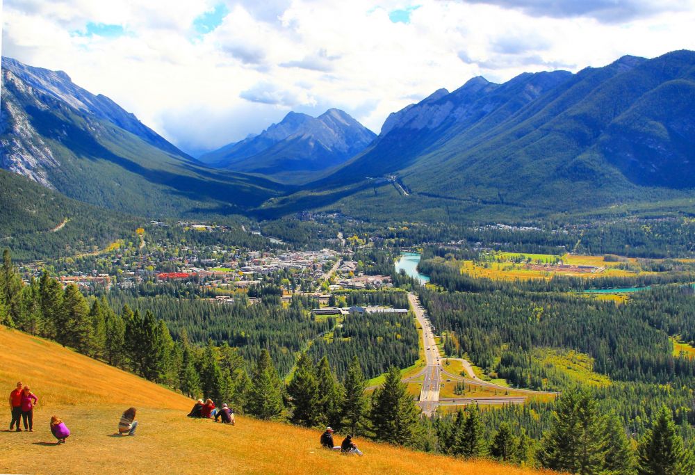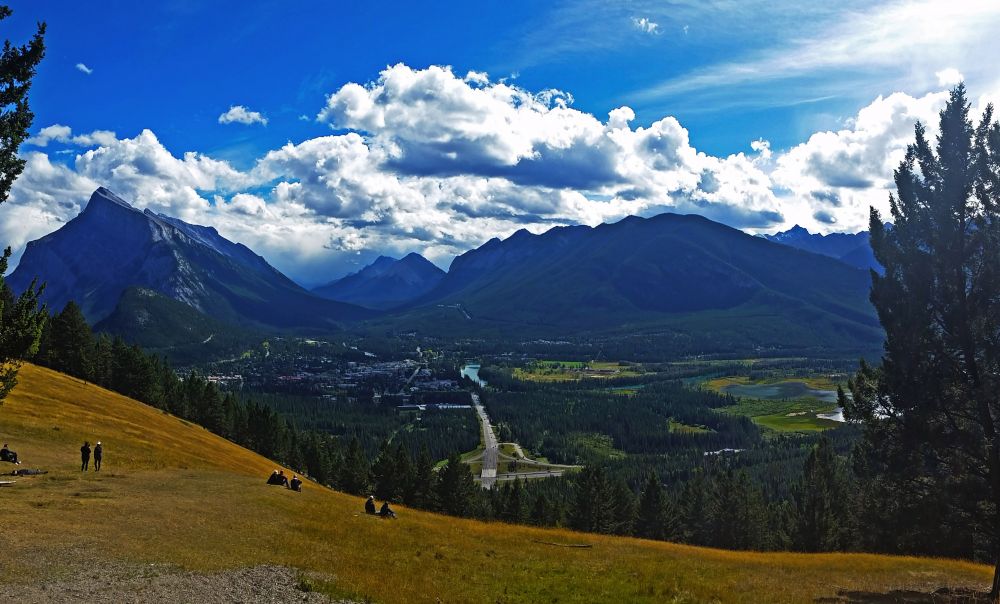 俯瞰Banff Town最好的位置其实不在观景台上,而是旁边一大片可以走上去的大草坡。站在观景台上看着其他人就那么躺在草坡上时其实觉得有点心虚,毕竟草坡的坡度不算小,周围却一点围栏都没有,总觉得一不小心就会滚下山坡。但当你真正走上去就会发现其实也没想象那么吓人。站在草坡上,俯瞰世界,有点瑞士阿尔卑斯山的风光,就像一幅油画。