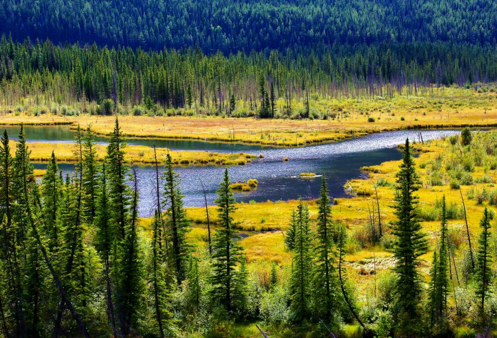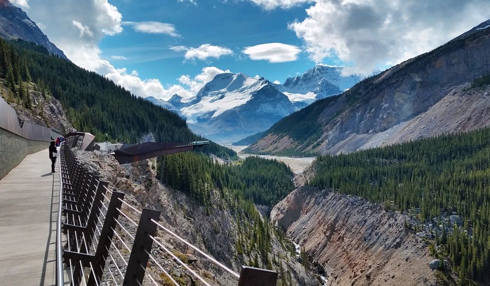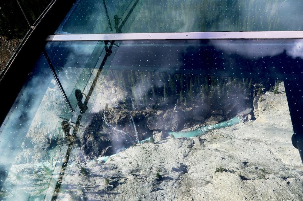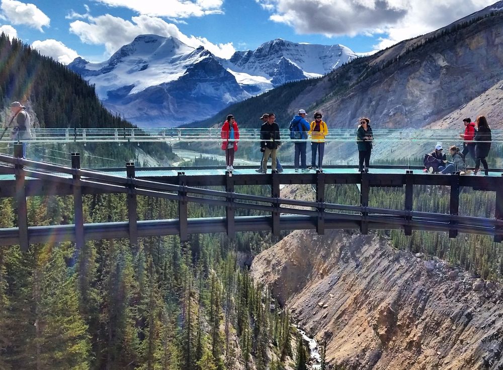 站在玻璃栈道上,脚下是300米深的Sunwapta山谷,看脚下涓涓细流,是流向远洋的融雪,远望山巅白雪皑皑好似蛋糕上的糖霜,其实是厚达100米的冰层,而对面山坡上郁郁葱葱的松林,也不知有多少年历史了。