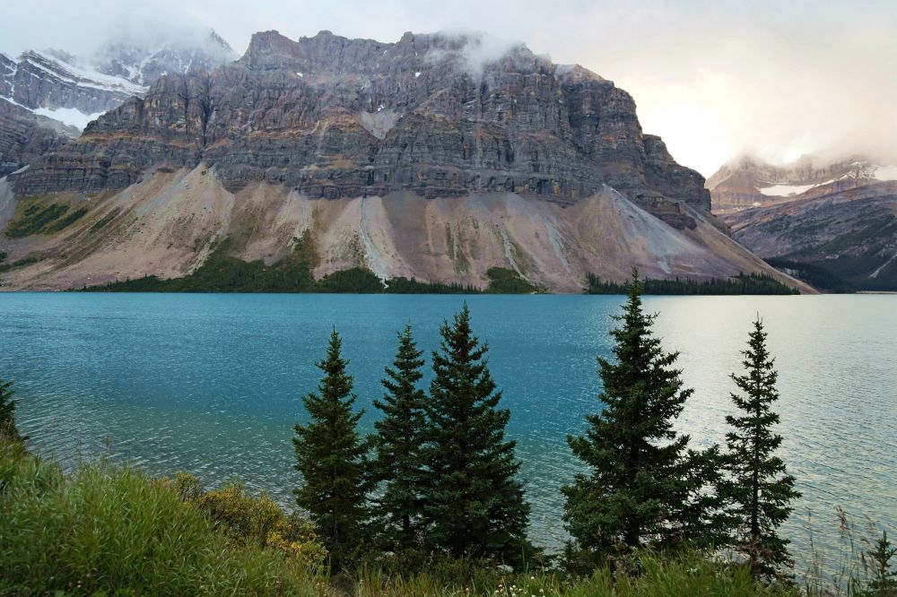 其实这时候的Bow Lake远不如之后晴天时美。之前看攻略有人把Bow Lake评为她最喜欢的一个湖,我们还觉得有一些名过其实。不过之后天气晴朗又有时间在湖边走了走后,才发现原来是名不虚传。