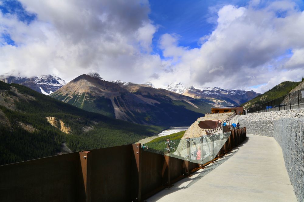 离开冰原,shuttle bus直接把我们送到不远处的Glacier Skywalk。因为时间还早,天空步道上人不算多,没有出现玻璃地板上全是人没有景的情况。门口有中文解说器,边听边看边走,也增加一点知识。