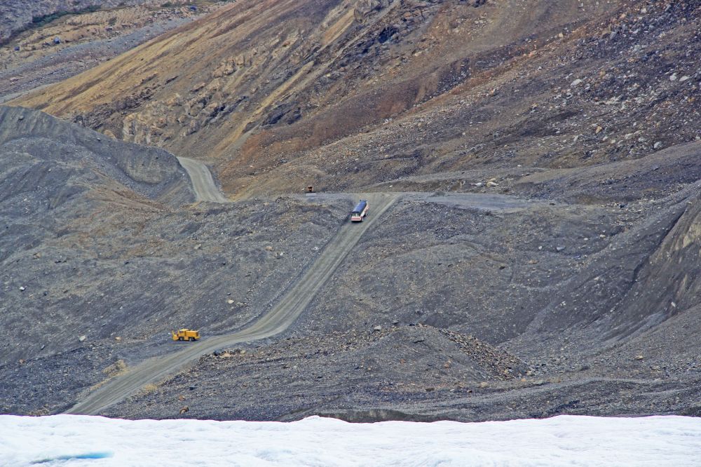 阿萨巴斯卡冰河是由于重力的挤压从冰原底部向坡地滑动的一条雪道,它载流的是冰雪、石块等较为沉重的物质,所以流速很慢。长达七公里的阿萨巴斯卡冰河一年的移动距离大约只有七米。