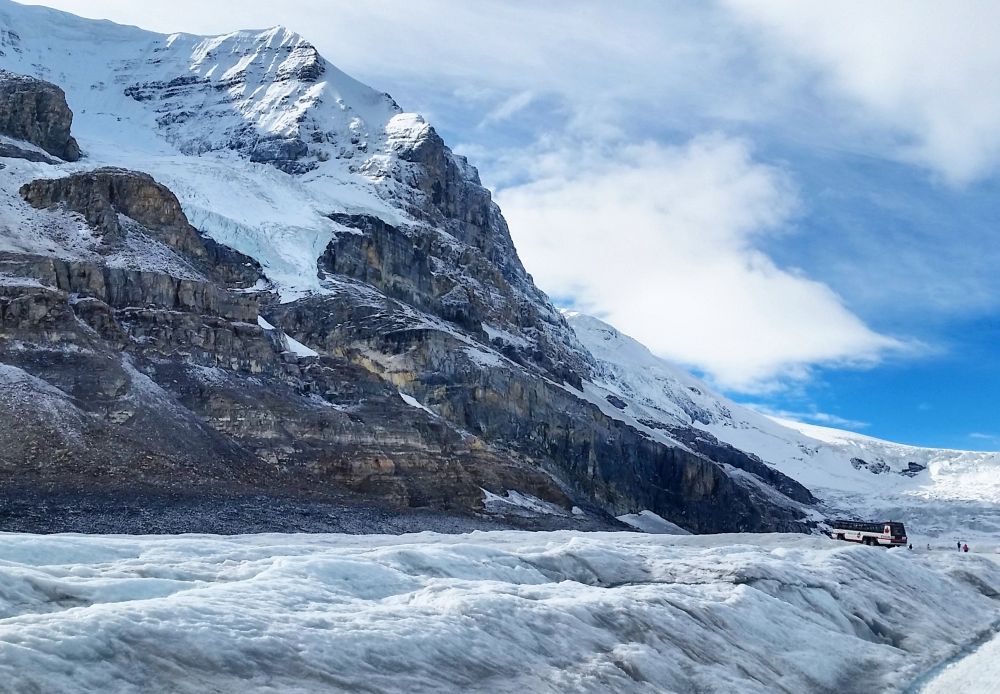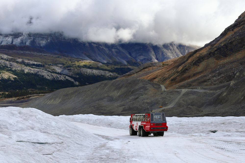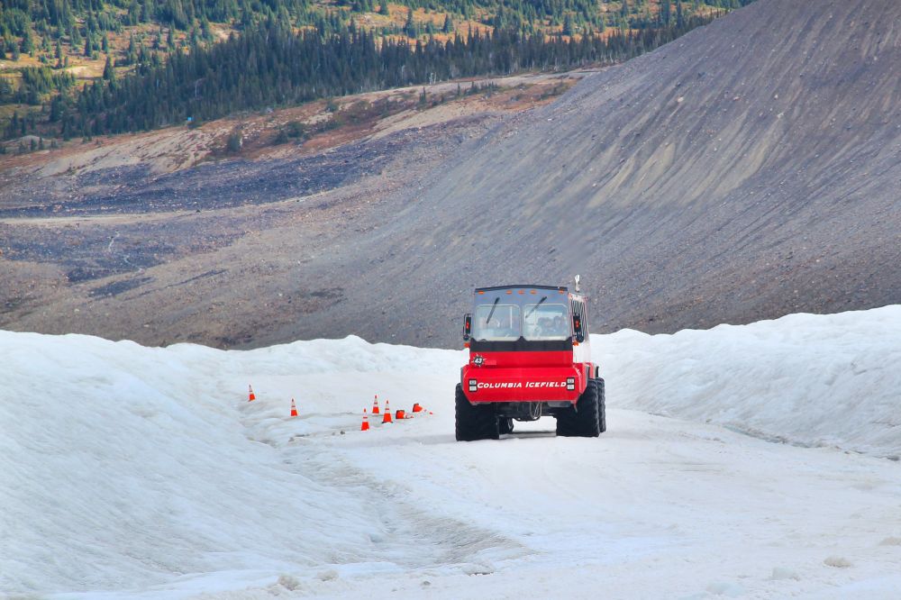 冰原探险每天从早上10点开始,每15分钟一班,开始会有普通的shuttle bus带你去到冰原车的专用停车场,再换乘冰原车真正踏上Athabasca冰河。到冰原的其中一段路是北美坡度最大的路,倾斜角度大于45度,据说这是北美最陡的一段路。从斜坡上往下开,实在让人心跳加快!也只有这种特制雪车的大轮胎能够安稳的开过。
