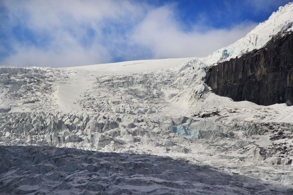 到乌鸦爪冰川的时候天气又开始阴晴不定,山顶已经有些被云覆盖了,不过还能看见乌鸦爪冰川。乌鸦爪冰川以前其实是有三个脚趾的,但现今还能清楚看见的只有乌鸦的两个脚趾,有一个脚趾因为近年来冰川融化已经完全消失了。