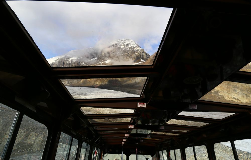 冰原车的车顶也是玻璃的,可以透过车顶看到外面巍峨的雪山。