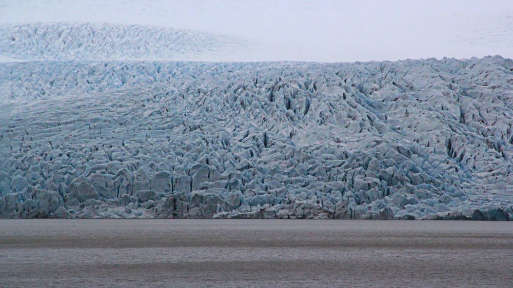 Fjallsárlón虽然规模远不如Jökulsárlón大,但其实人站在岸边,离对面的冰川更近,更能感受到冰川的庞大和宏伟。站在岸边,对面的冰川绵延,深入云端,还有绝大部分的冰川隐藏在了云雾之中,更有一种飘渺欲仙的感觉。