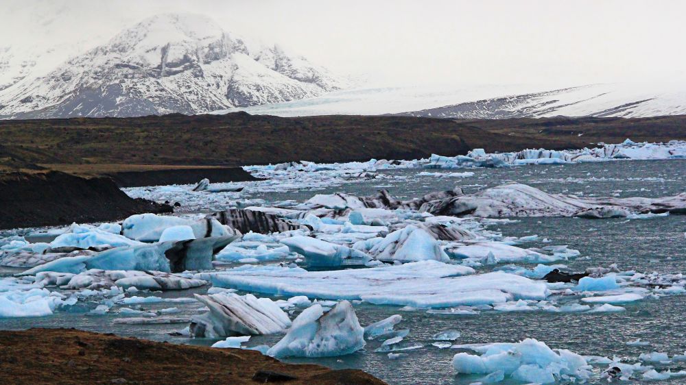 之后过桥来到了湖对面的一个停车场,这边明显人要少多了,从停车场能看到湖面我们之气停车的位置。天气一直没有好转,但不知是因为涨潮落潮,还是角度不一样,这一面的冰河湖显得比较空旷,湖中没有那么密集的浮冰。流动的湖水和飘零的浮冰,每一天到冰河湖来都不会是完全一样的景色,这也是冰河湖独特的魅力所在。