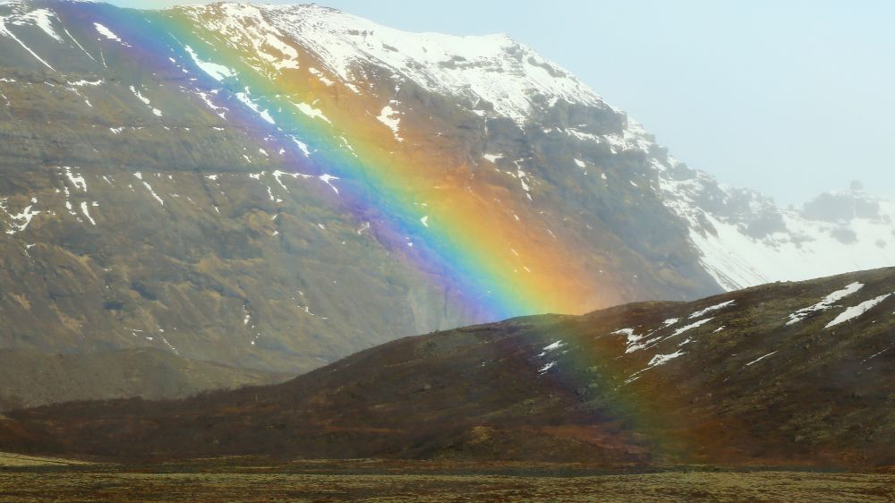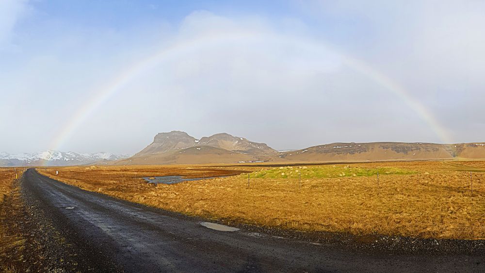 从Fjallsárlón到国家公园Visitor Center的一路上,雨渐渐停了,头顶甚至露出了间隙的蓝天,路上还有一道完整的彩虹横跨天际。这时我们觉得终于看到了曙光,等来了天晴的时刻。