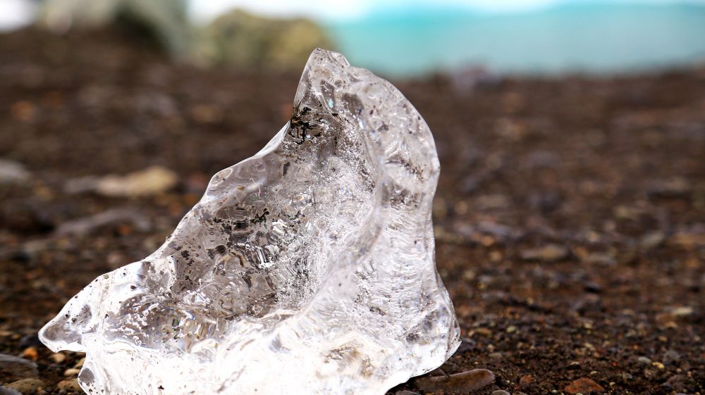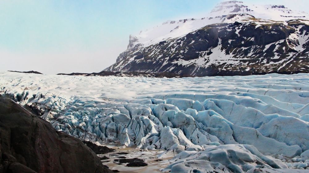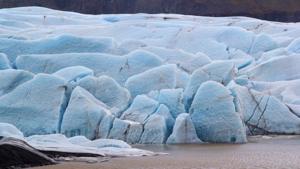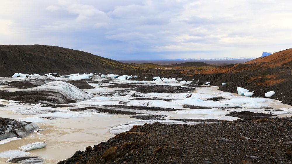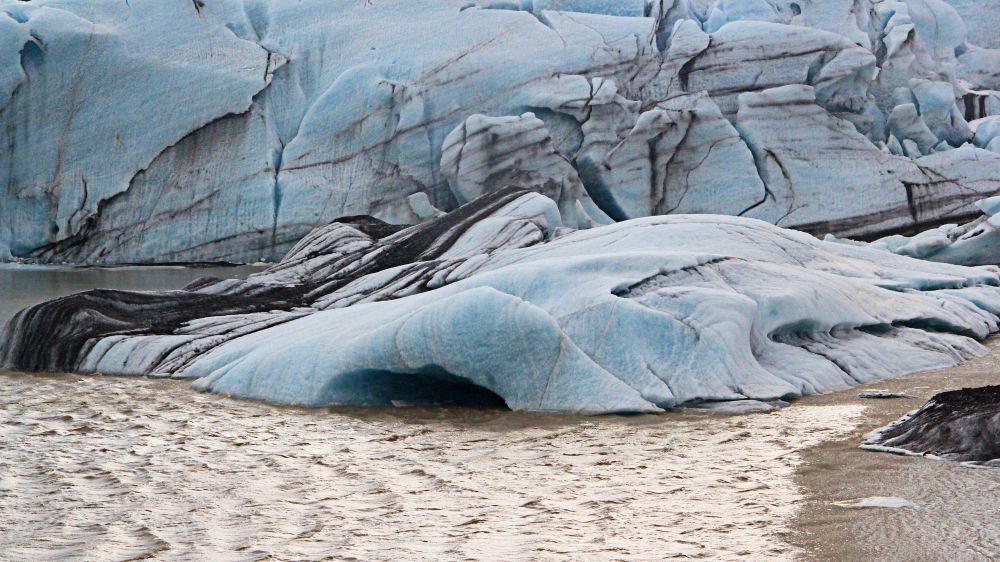 说是lookout,其实就是冰川旁边的一个土坡,人在沙土和大石块中穿行。站在土坡上,泛着幽蓝的冰川就横在眼前。靠近外围地方的冰层里被火山灰染出了一道道独特的纹理。