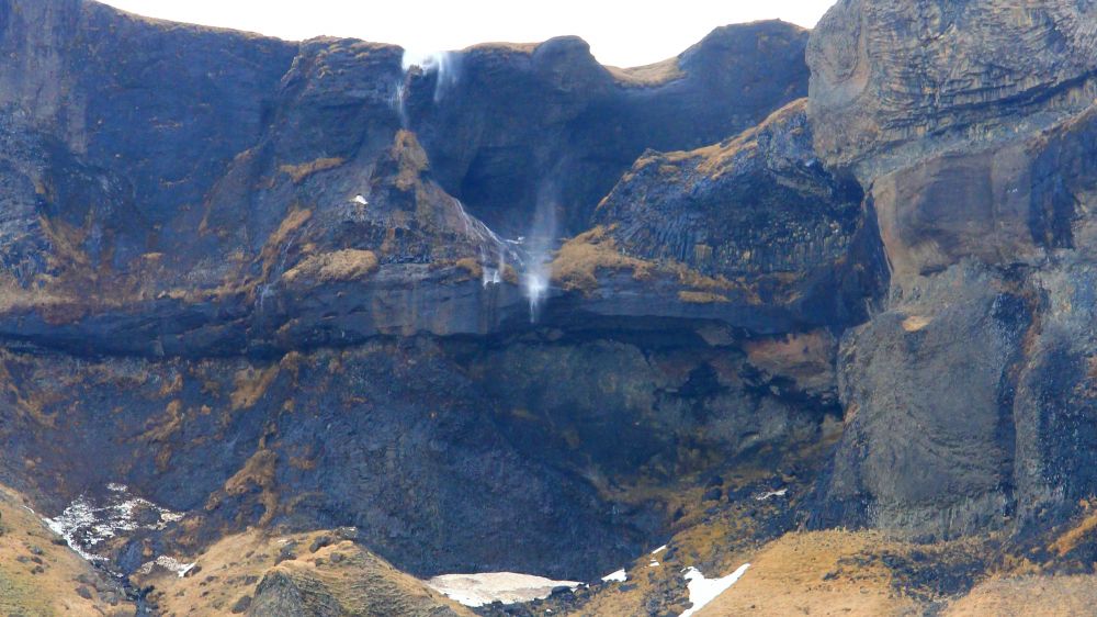 之前来的时候天气不理想也没有那么多时间,我们放弃了Dyrhólaey,回程的时候时间比较充裕,我们本想把这个景点补上。转上218,一路向山里开,快到尽头的时候出现一条上山的岔路,路标指示去Dyrhólaey要转弯。可是这时天气越发糟糕,风越来越大,目测上山的那条小路非常不好走,再加上开山路不是我们的长项,我们最终决定不上山了,还是沿着山下的这条小路开到了尽头Kirkjufjara beach的停车场。