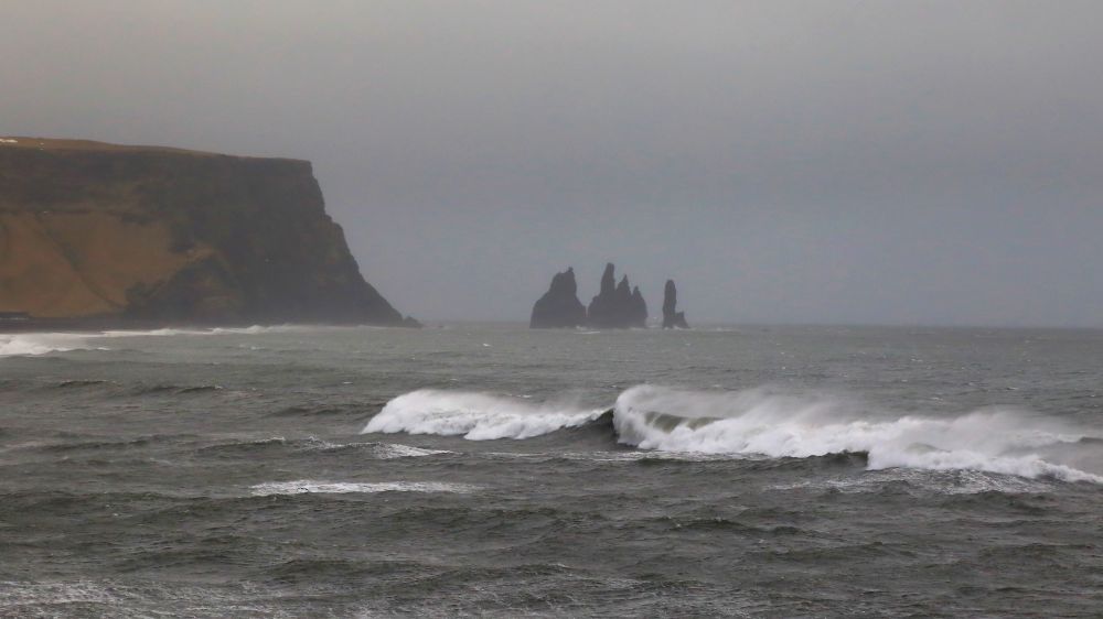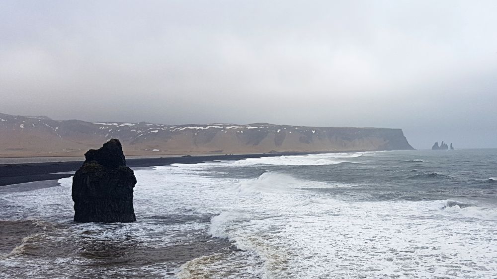 在Kirkjufjara beach停车场边,也有几个lookout,可以远眺对岸黑沙滩的玄武岩,海中央的Reynisdrangar岩和近处沙滩上独一块的Arnardrangur(Eagle rock/鹰石)。只不过这是能见度太低,只能隐约看到鹰石和Reynisdrangar岩的剪影,玄武岩是完全看不见了。天气好的时候应该能够走到沙滩上,但就今天的天气,我们还不想靠近危险的海岸去挑战大海的威力。