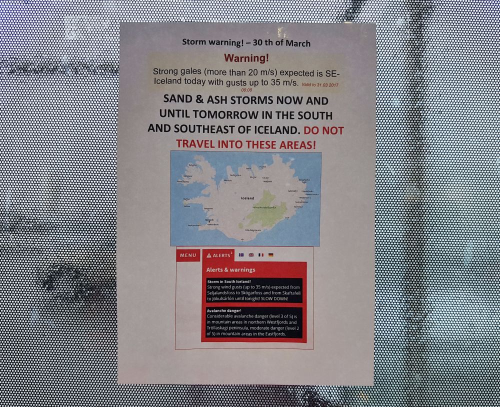 今天一天我都在强调天气是因为,直到我们回机场还车那一天才看到在租车公司贴着的一张风暴警告,时间正是我们从冰河湖回来的这一天。那时我们才知道,今天的风速超过20m/sec,换算过来,就是超过每小时70公里的狂风。狂风会卷起大量的沙尘,形成沙尘暴,租车公司还特别用红字警告游客这一天不要开车前往冰岛南部地区。想我们居然还一无所知,就这样一路被风暴追着走,横穿了整个冰岛南岸,没在路上被风把车掀翻了也是运气。