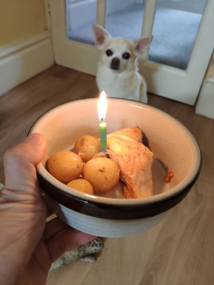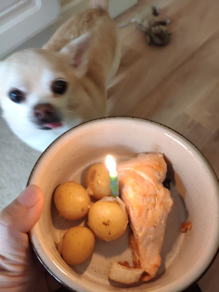 跑遍所有宠物店和超市,竟然都没狗子的生日蛋糕!只能在他最爱的三文鱼和土豆中插根小蜡烛了!