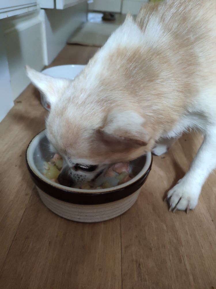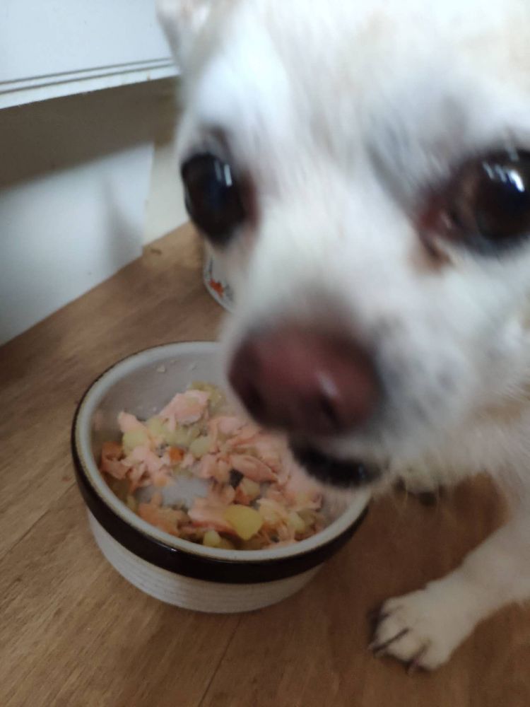 我们也和他吃一样的生日餐!狗爹回家后,还给他洗了个澡。他吃饱饱洗香香,应该心满意足了吧?!