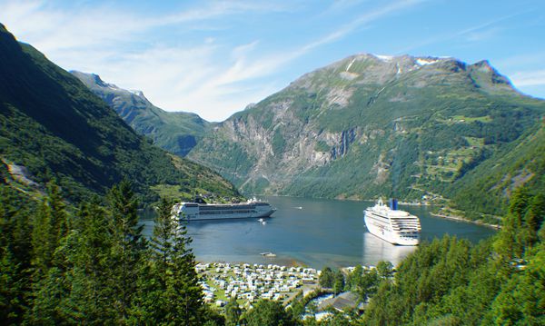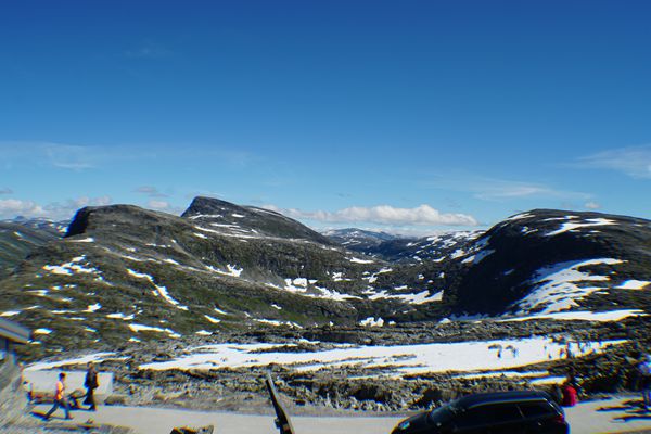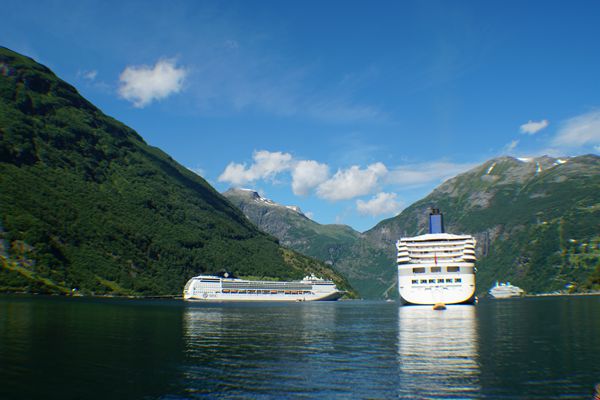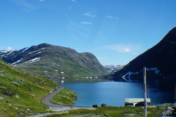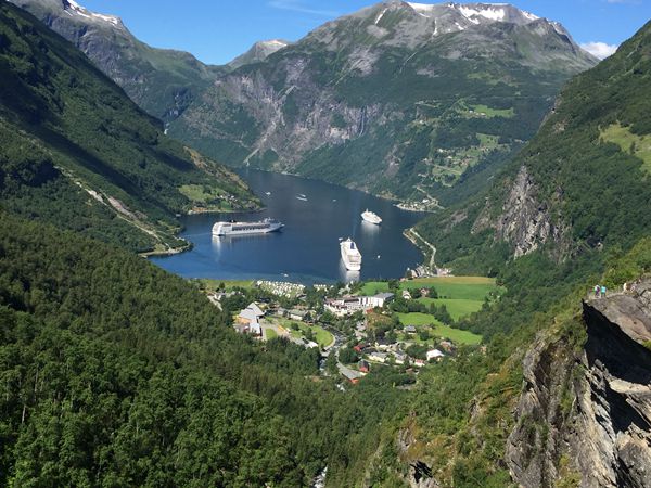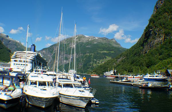 7月20日,碧蓝的天空散落着朵朵白云,老天知道这个陆地游是我们此次的重点,给了我们一个大礼:晴天。邮轮缓缓地驶入盖伦格峡湾(Geirangerfjord),这是挪威sunnydus深入大陆最深的峡湾,也是本次行程中最美的峡湾。它被列为世界文化遗产,全长16公里,两岸山势峻秀壮丽,自然雄伟的陡壁多在1000米以上的高度。我们搭乘巴士上山,一路饱览壮观的雪山、瀑布(“新娘面纱”“七姐妹瀑布)、湖泊、牧场…美了眼醉了心!
