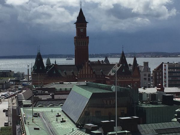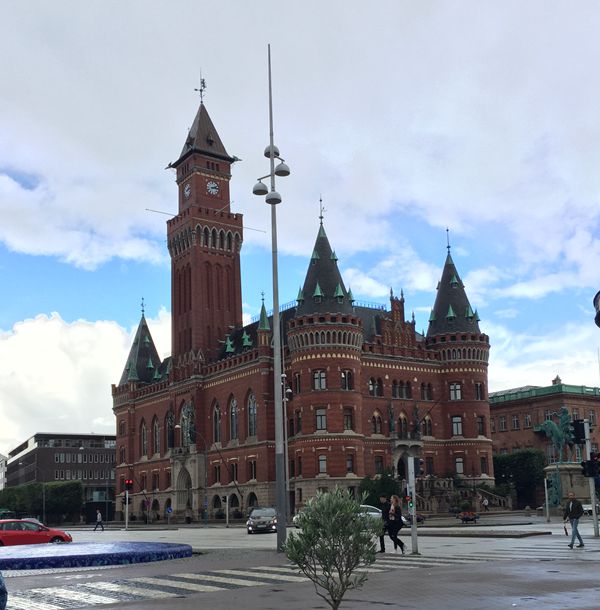 当我们走出赫尔辛堡的码头/车站大厅后,第一个映入眼帘的是市政大厅的红色尖塔,高高的插向天空。