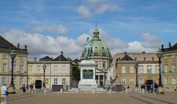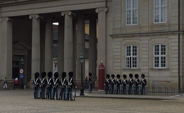 阿美琳堡宫(Amalienborgslot)十八世纪中叶建造,是王宫的主要宫殿。王宫位于八角广场的四周,由四座完全一样的宫殿组成。每当女王在宫殿时,其所在建筑物上便会升起丹麦国旗。游客可以参观其中两座宫殿,一座现为皇家家族博物馆,另一座为女王接待外宾的专用。到了中午时分,我们还观看了别具一格的换岗仪式。
