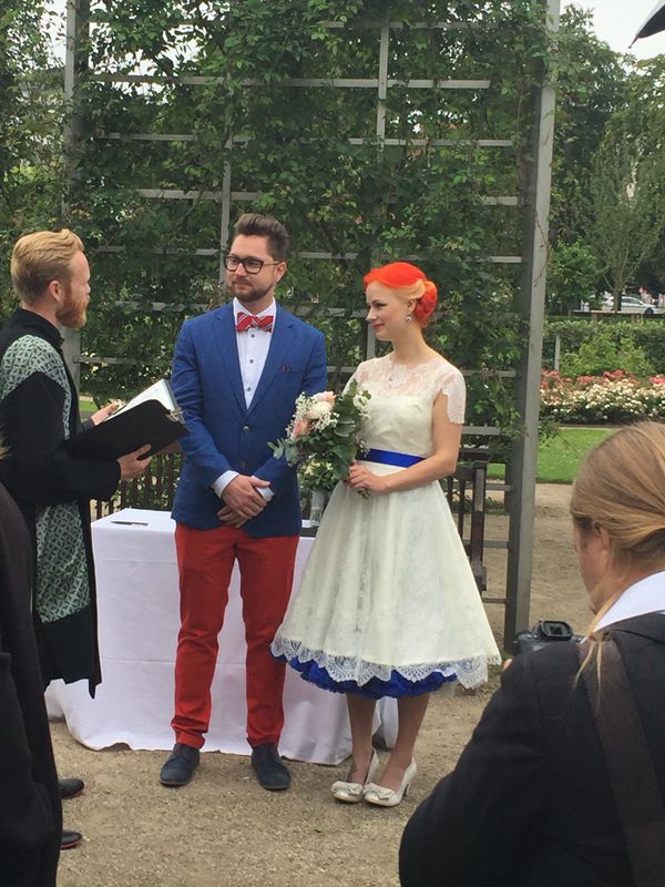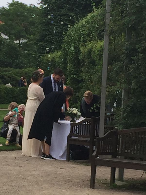 Day 6:我们的邮轮登船是下午五点,白天的余暇。闲逛了哥本哈根一个不知名的小街心花园 ,在那里,我们看到了非常温馨的一幕:几对年轻新婚夫妇的婚礼就在小花园的草地上简单地开始了,牧师主持,几个亲属围住新娘和新郎,宣誓和照相完毕后,大家就围坐在草地上,吃蛋糕了。