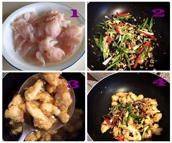 4)避风塘料倒在炸好的鱼片拌匀摆盘即可。