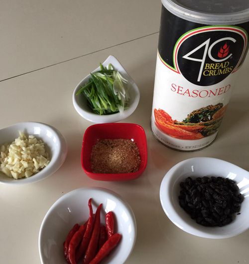 配料:蒜粒,豆豉,红干辣椒,葱丝,面包糠。