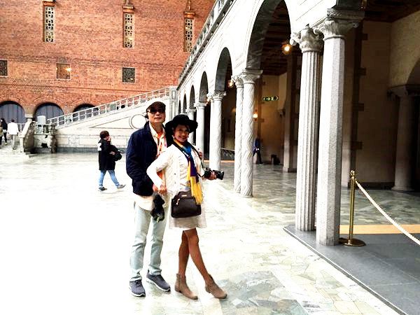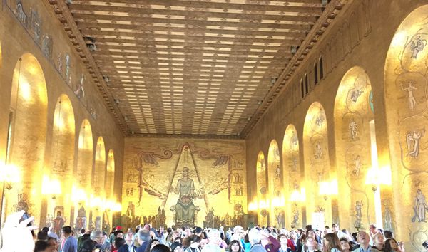 国会市政厅分“蓝色大厅”和“金色大厅”。我们最先去的是宴会厅,也有“蓝厅”的誉称。每年的12月10日是诺贝尔逝世日的这一天,诺贝尔奖金颁发后,瑞典国王和王后都要在这座宴会厅内,为诺贝尔奖金获得者举行隆重盛大的宴会,表示热烈的祝贺。