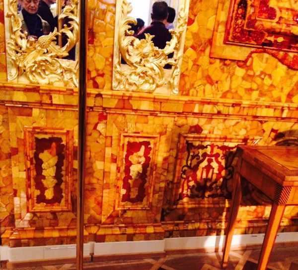 琥珀厅(不允许拍照,朋友偷拍的)。整个大厅是用名贵的琥珀、黄金、镜片、和其它的宝石镶嵌起来的精美工艺。有种惊艳的视觉震撼。