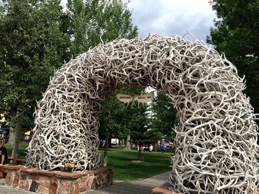 公园的四个门是用真的雄野鹿角搭建的。导游介绍,百年前一个叫杰克逊的商人建起了小镇,很快繁荣起来了,由于小镇的建立,挡住了野鹿群返回黄石的通道。 因此,在小镇外生活着8000头野鹿。公鹿们每年为争夺配偶都要进行激励的角斗,然后导致大量的鹿角脱落,人们就捡来搭建了这四座独特的“野鹿角门”。