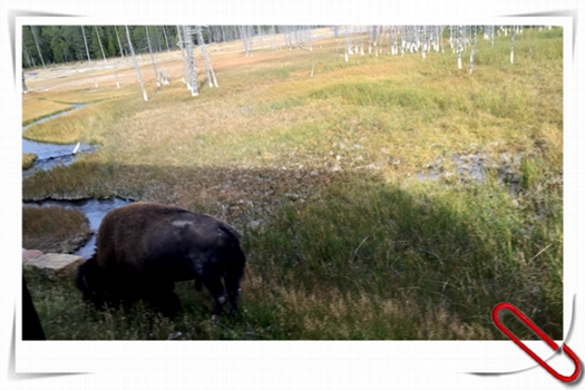 车窗外发现成群的美洲水牛及麋鹿等悠闲地漫步在树林里,有一头水牛离我们很近。导游在车里向我们介绍了这举世闻名的公园,它是世界上最大的国家公园,近9千平方公里,跨越3个州,开车在里面跑一天只跑完百分之一的范围。