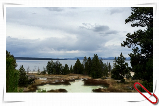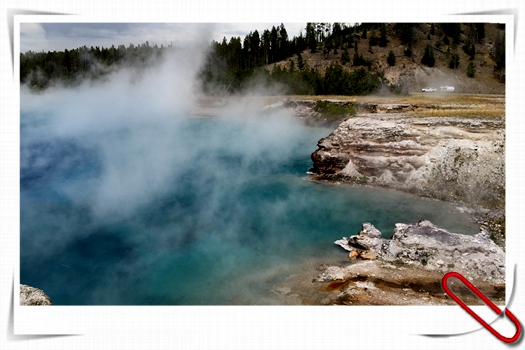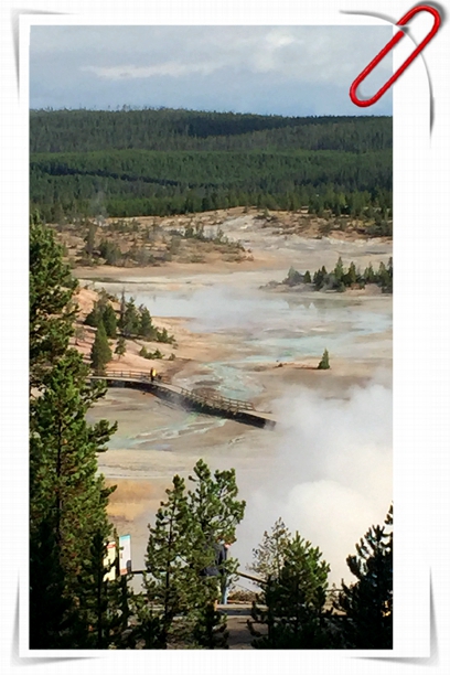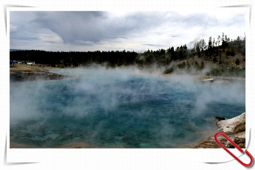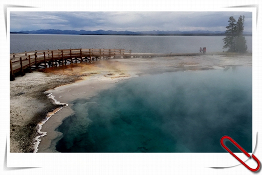 我们的导游在车里一再叮嘱我们,要走沿湖的木栈道,千万不要踩到地热上,会陷进去烫伤的。由于黄石公园的石头是高含硫量的,使得湖水看上去非常清澈,但不能喝,也不能游泳。栈道的右侧,低头是栈道旁湖水里一个个冒着气泡,硫磺味中蒸腾着白色的烟雾,抬头望去,近处是烟波浩渺的大湖,远处是若隐若现的山峦。。。真的感觉到了人间仙境。栈道的左侧则是色彩斑斓的蒸汽池,间歇泉,喷气孔。。。