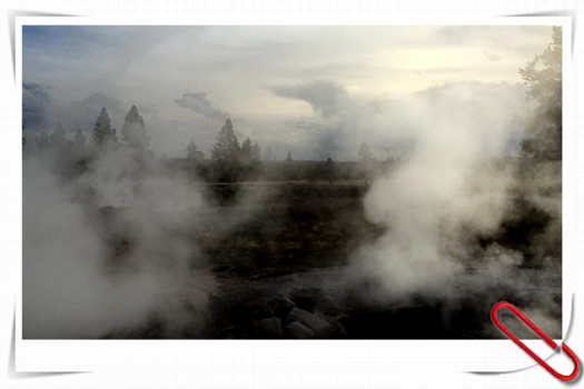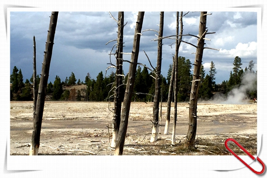 沿着栈道从黄石湖到老忠实喷泉方向走,一路上到处都是白雾蒸腾的地热泉口,一股股硫磺的气息扑面而来,导游指着一些只剩树干的枯树说“这些树叫‘鬼树’,都是死树,硫磺水把它们的根烧毁了,使每棵树干都变成了白色。”我们放眼望去,真的在地热喷泉池旁有很多这样的诡秘树群。