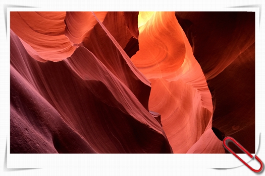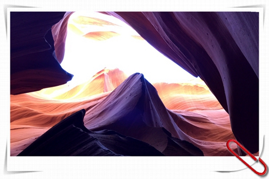 它分为“上羚羊”和“下羚羊”两个彩穴。我们去的是“下羚羊”,由一位黝黑的脸上总是带着憨笑的印第安小导游带领下,每组10人,分别通过一段段又窄又陡的铁梯子下到洞 穴,进到里面后,我为这世界八大奇观之一的色彩完全震撼了,峡谷中那些不可思议的柔美曲线,加上岩石本身含有的矿物质,在阳光的照射下,呈现出橘。黄。红。紫。蓝。灰等绚烂多变的色彩。