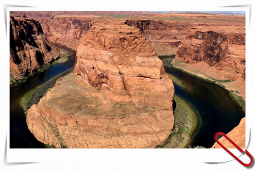 当我们顶着烈日步行了20分钟后,一个世界上的奇迹出现在我们的眼前:广阔的平地嘎然裂出了个大大的弯曲峡谷,里面奔流着河水。峡谷是金红的,河水是碧绿的,形状真的像大大的马蹄踏在了红土地上。这就是很多摄影作品中的“马蹄湾”!