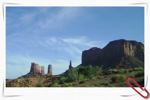纪念碑谷并非真正意义上的河谷,它曾经是一块广阔的盆地,亿万年来地心缓慢而温和的压力不断抬升,使之成为高原。历经风和水的腐蚀,曾经覆盖全区的页岩只残留下一群石碑,石塔,石柱,散落在空旷的沙漠中。这些散落的石碑高至300米,称Mesa,小的只有几十米,称作Butte。我们被这里的广鹜而苍静的气魄又一次震撼了,这让我想起了那句“大漠孤烟直,长河落日圆”的诗句。这片吸饱了阳光的山石放射出奇异的色彩,甚为壮观!