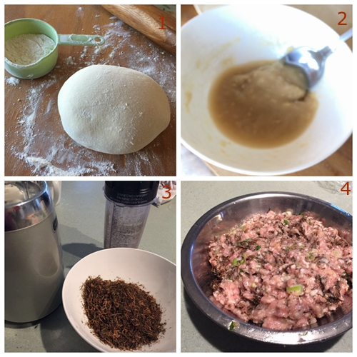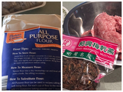 4)肉馅1磅,少许盐(要考虑到梅干菜里的盐分),油,五香粉,香油,葱花拌