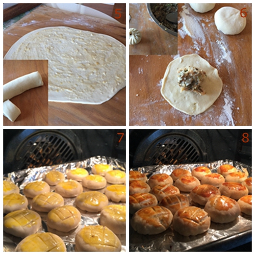 6)揪成小剂子,擀成包子皮,包小包子方法入馅料,用手压成小饼。