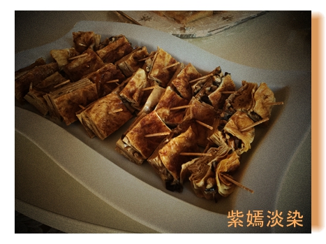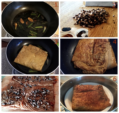 这道菜是用新鲜腐皮和香菇做成的,对素食者来说,做这道菜是非常好的选择,因为没有肉但口感很像肉;对想带菜去参加聚会的人来说,也是不错的选择,因为不需要在聚会当天做。作为冷盘,头天晚上就可做好,第二天从从容容的带着既漂亮又美味的菜肴去和朋友们分享。