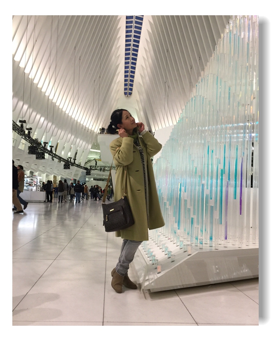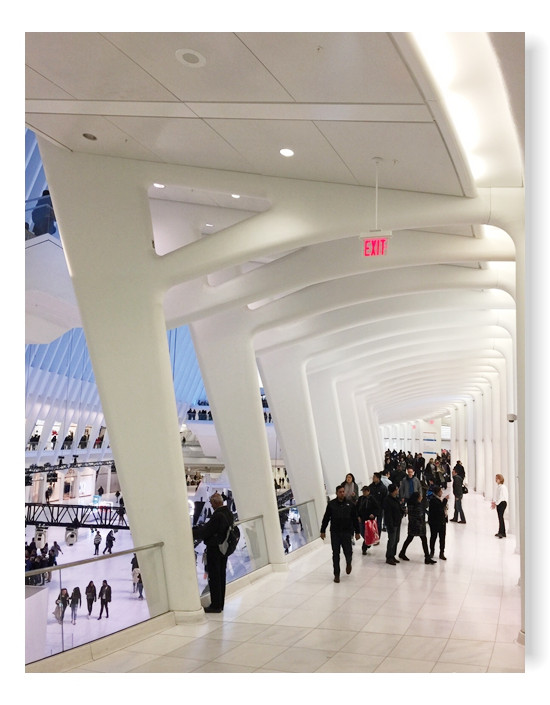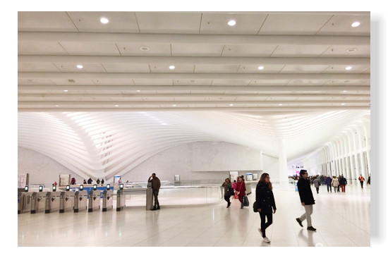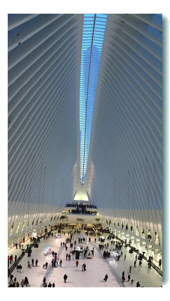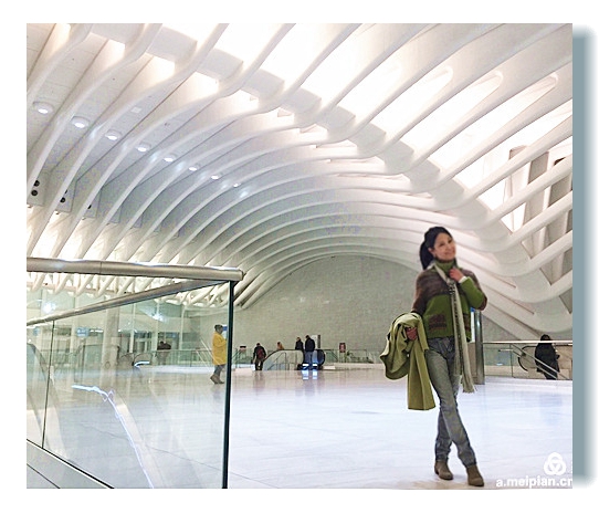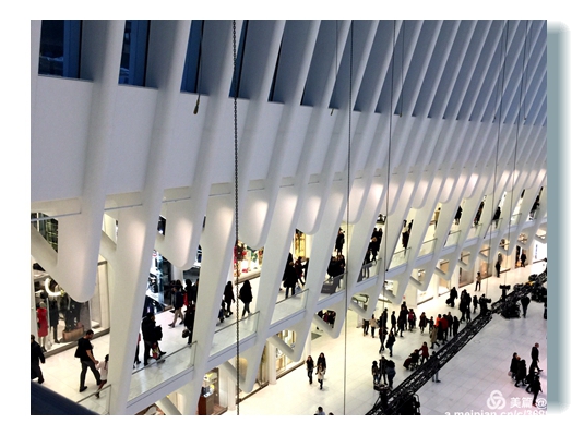 我们搭乘Path 30分钟就到了NY 的世贸大厦遗址的地下广场地铁站的出口。这是“西田纽约世贸购物中心”的大厅,它承载着市内13条地铁站、纽约市和新泽西之间的PATH火车站以及轮渡站.