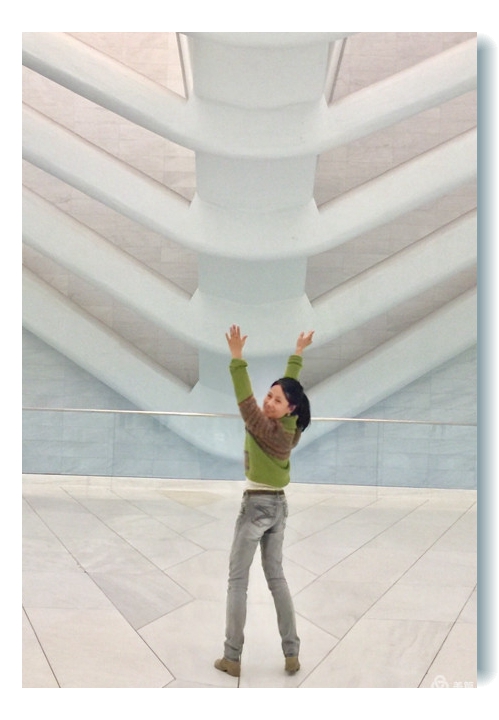 这张照片是LG 拿着手机,趴在地上照的,地是光亮洁白的地,不脏。天窗上的玻璃天窗正好映出了在世贸遗址上新建的最高楼“塔楼” 。 “白鸽”的“脊柱”是24小时的采光玻璃天窗,所以该建筑的名字叫“Oculus”,意思是“眼窗”。