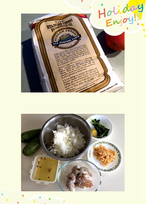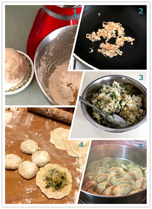 材料:面粉(4cup)小西葫芦4个,冻虾10余个,虾皮适量,香菜(一大把),姜末,