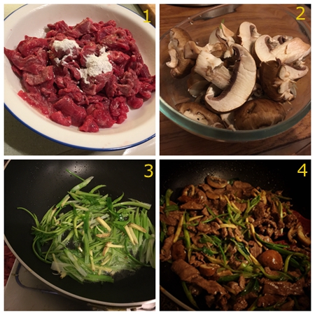 5)炒锅内加油,放入:芹菜丝和葱姜丝,蘑菇片和油滑熟的牛肉片翻炒数下后淋芡汁