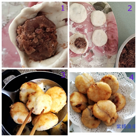 2 手揪一小块面团,手指压扁成面饼,包入红糖豆沙馅。