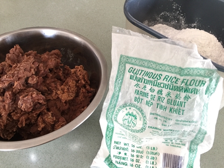 1 糯米粉一点点加入适量水,5克发酵粉(Yeast)面包机发酵会泡松(一般不发酵)做成面团,盖好防止水分蒸发。如果不用面包机,放入发酵粉后暖处静置1小时也可。