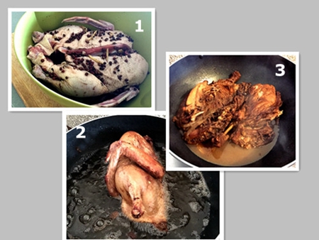 2)锅内放油,将两半鸭子皮炸成金黄。